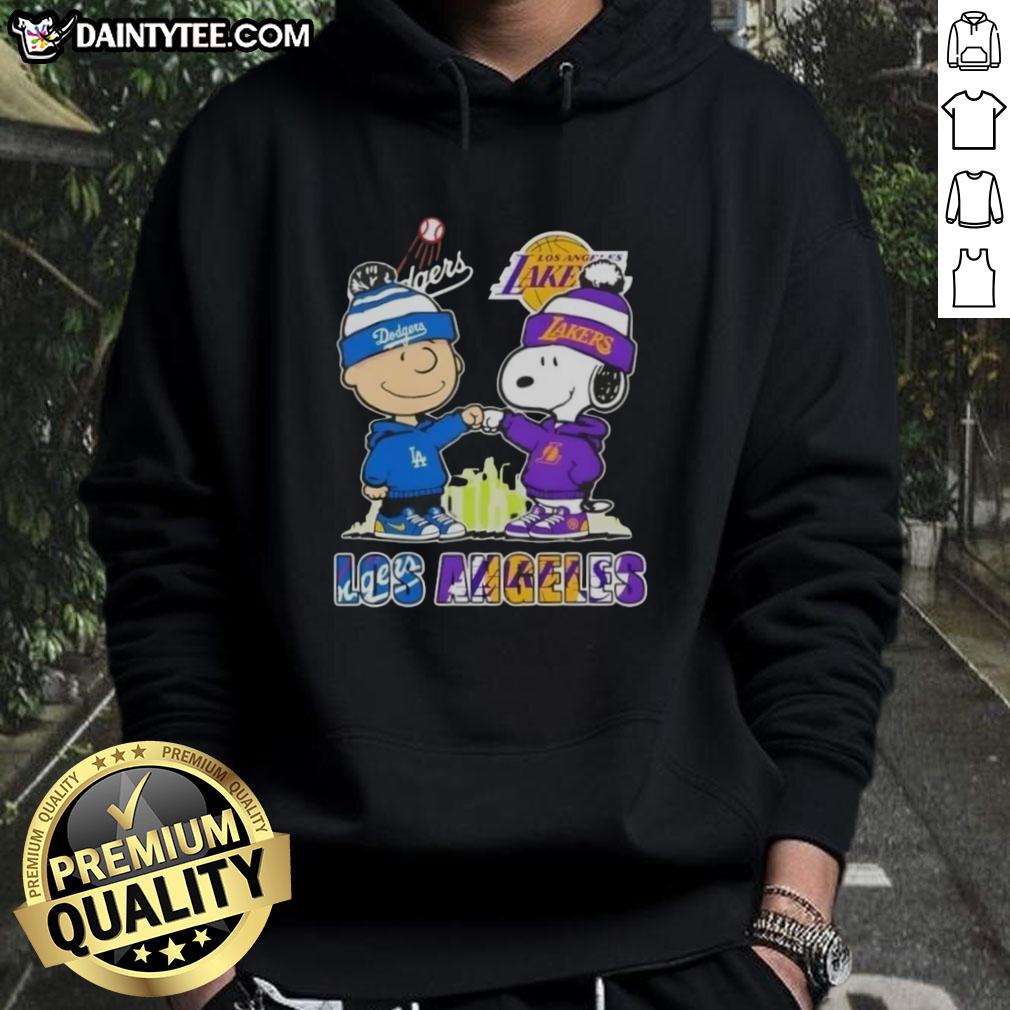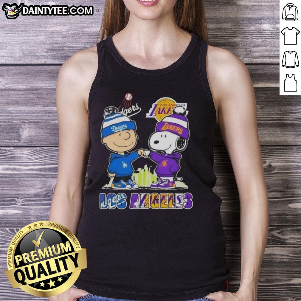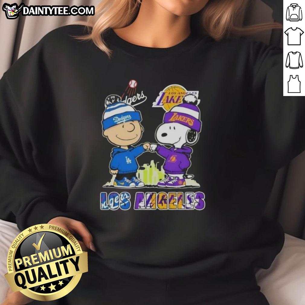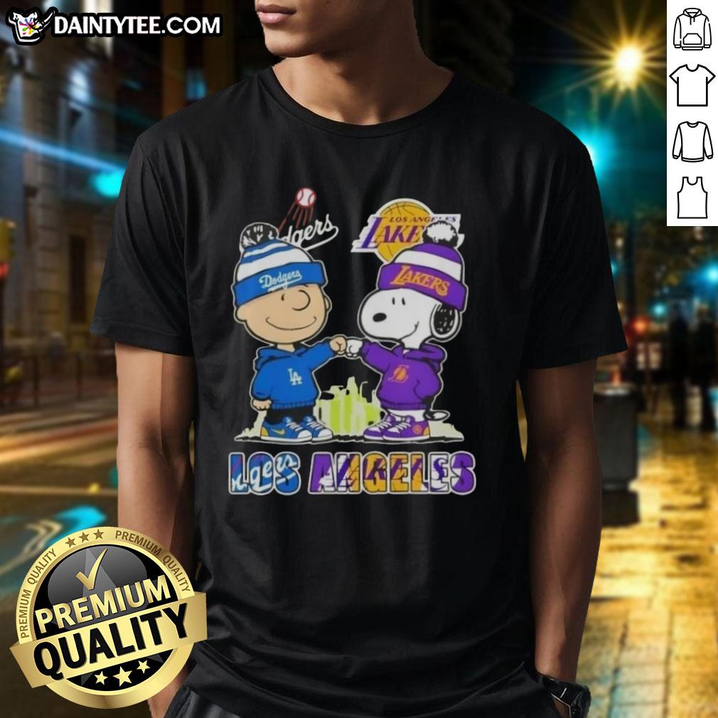 Awesome Charlie Brown Fist Bump Snoopy Los Angeles City Sports Dodgers X Lakers Skyline T-Shirt