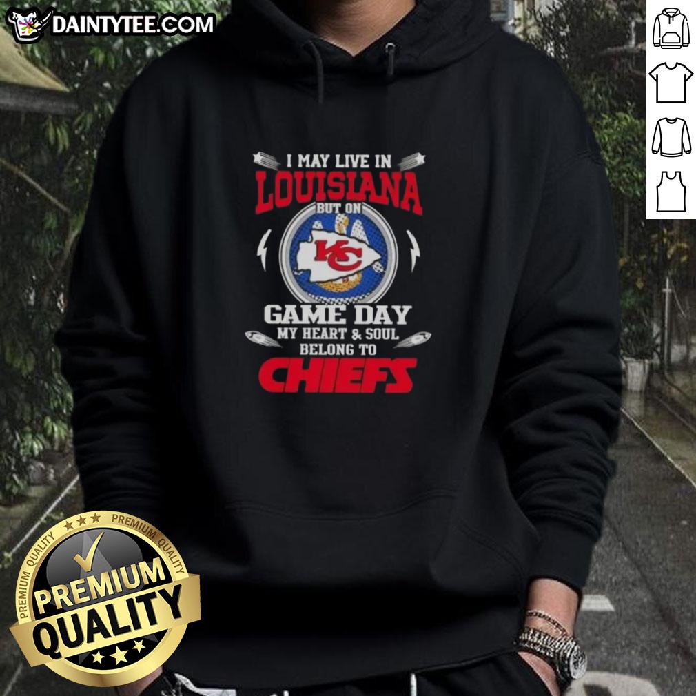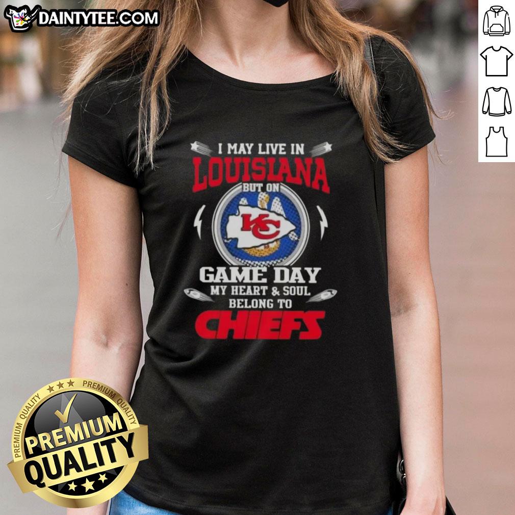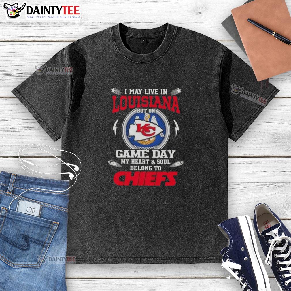 Awesome I May Live In Louisiana But On Game Day My Heart And Soul Belongs To Kansas City Chiefs T-Shirt