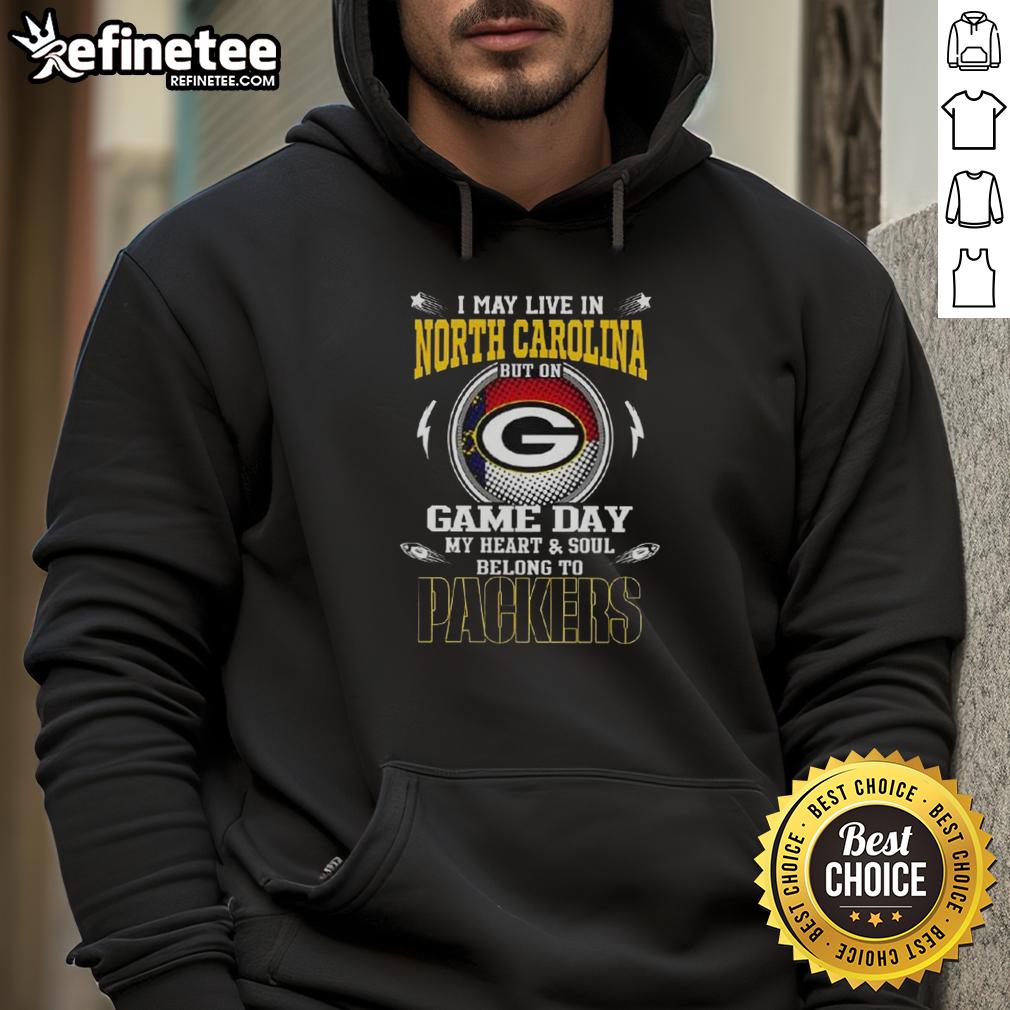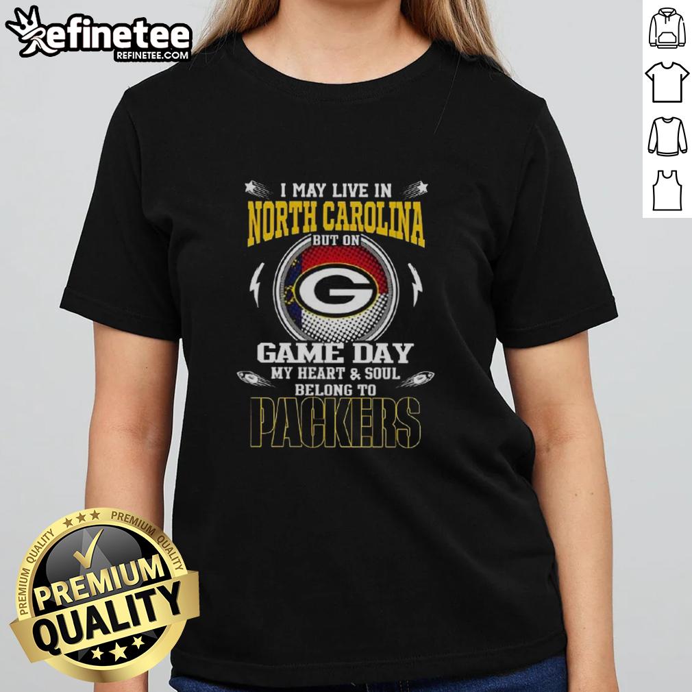 Awesome I May Live In North Carolina But On Game Day My Heart And Soul Belongs To Green Bay Packers T-Shirt