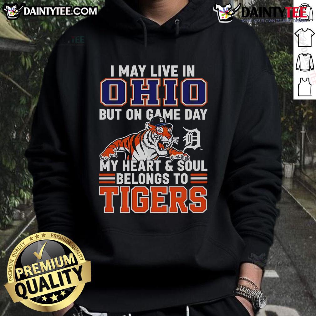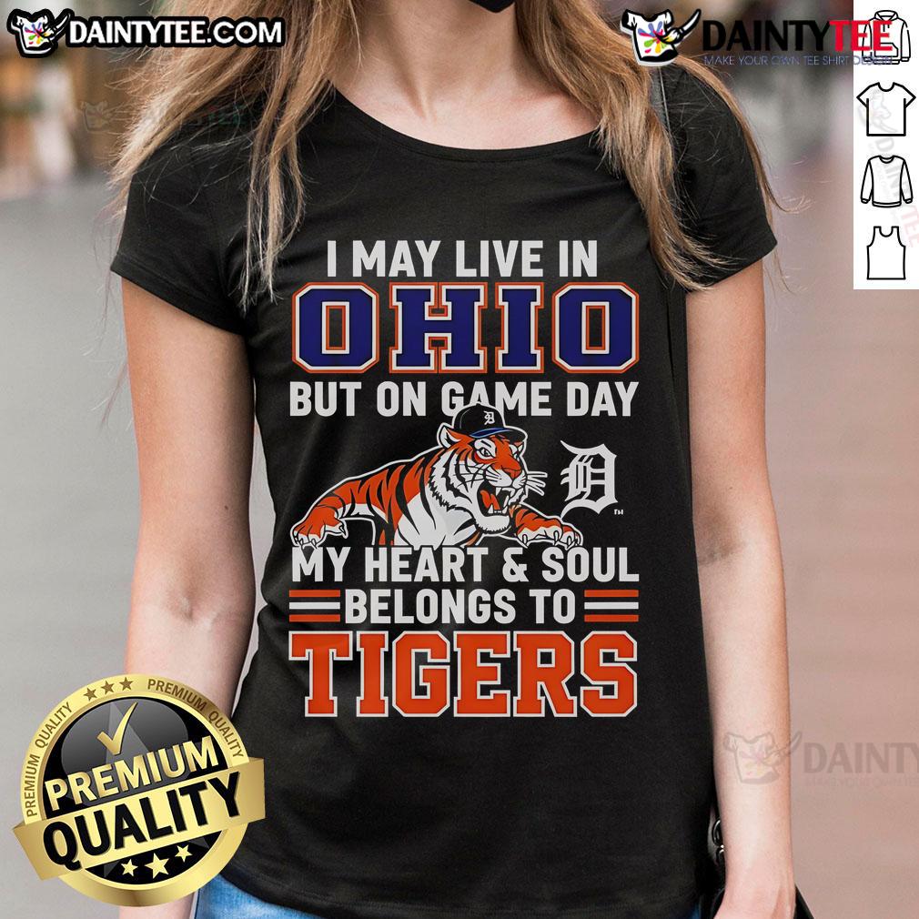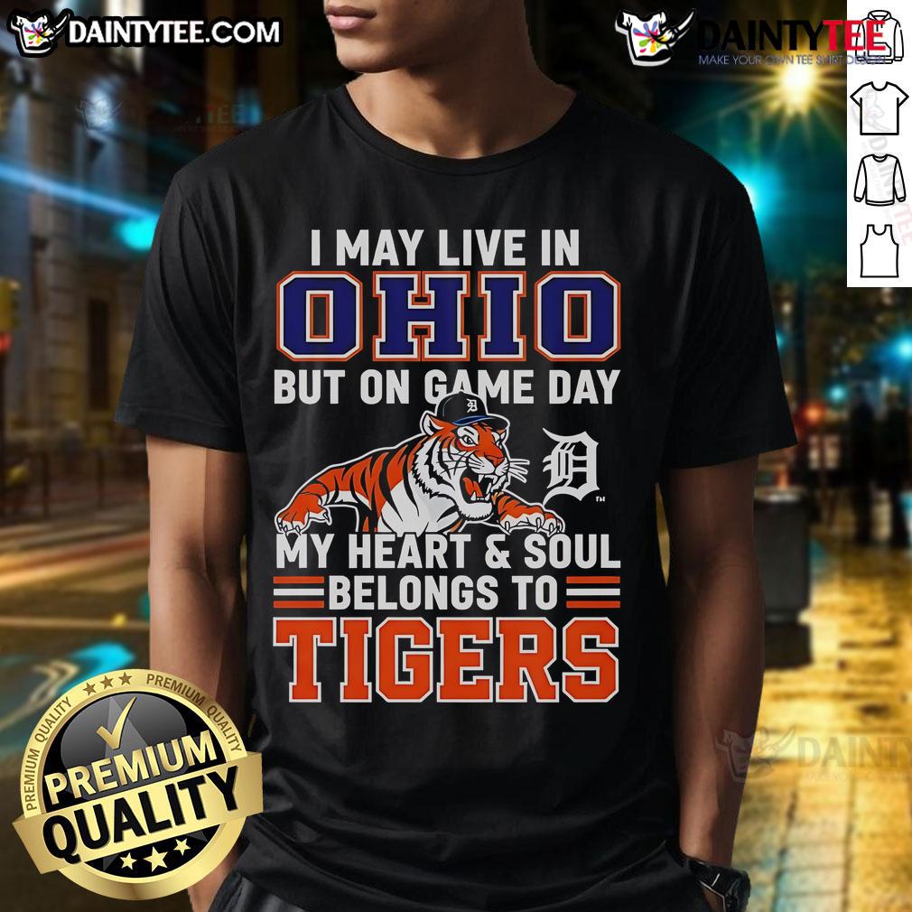 Awesome I May Live In Ohio But On Game Day My Heart And Soul Belongs To The Detroit Tigers T-Shirt