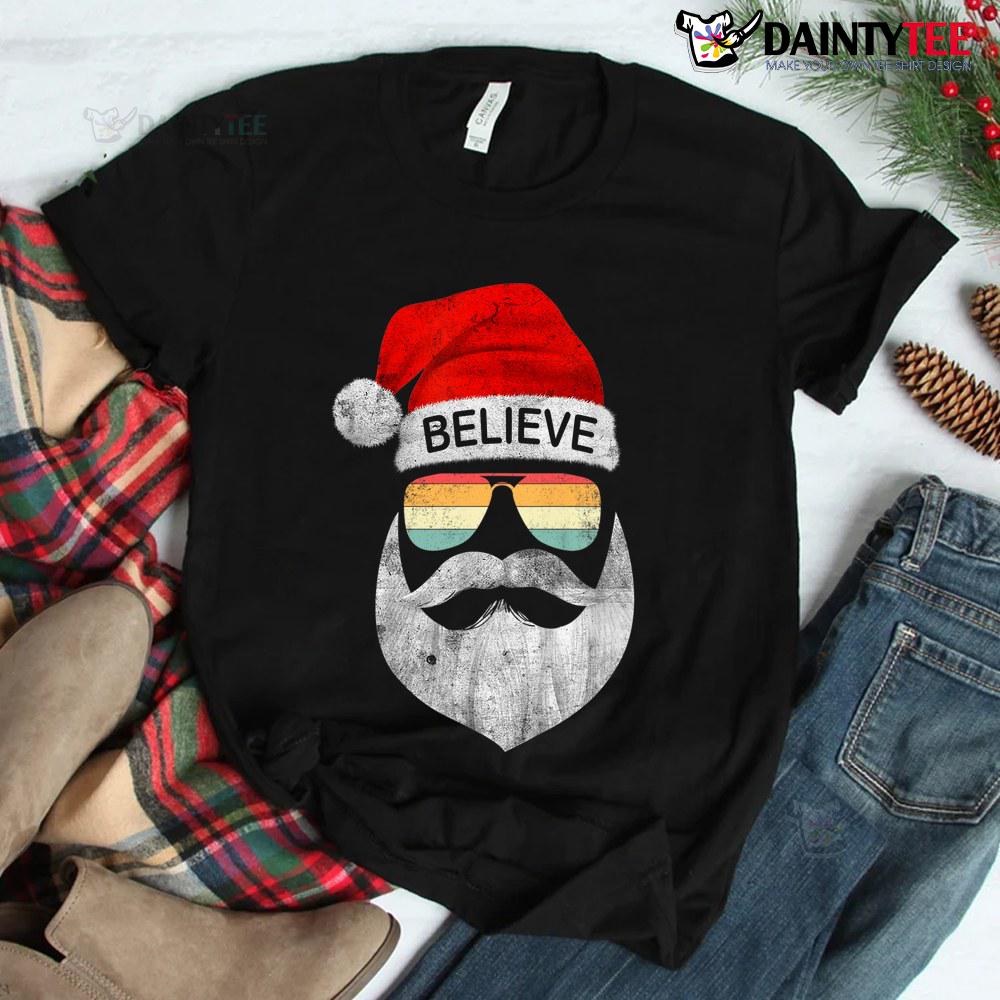 Believe In Santa Hat Mustache Vintage Sunglasses Christmas Shirt