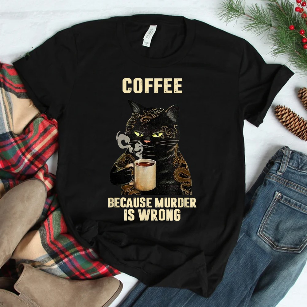 Black Cat Drinking Coffee Because Murder Is Wrong Shirt