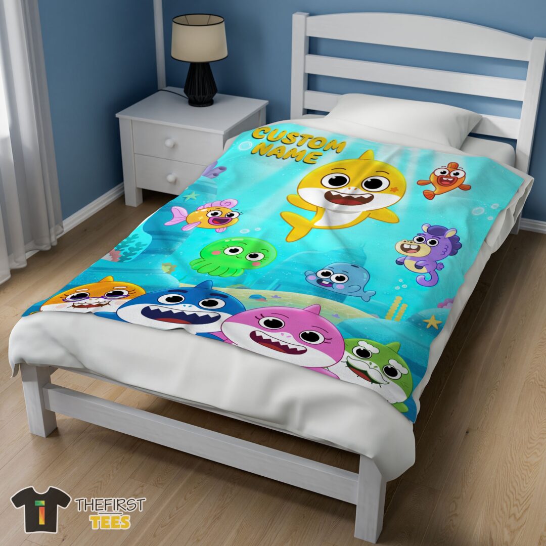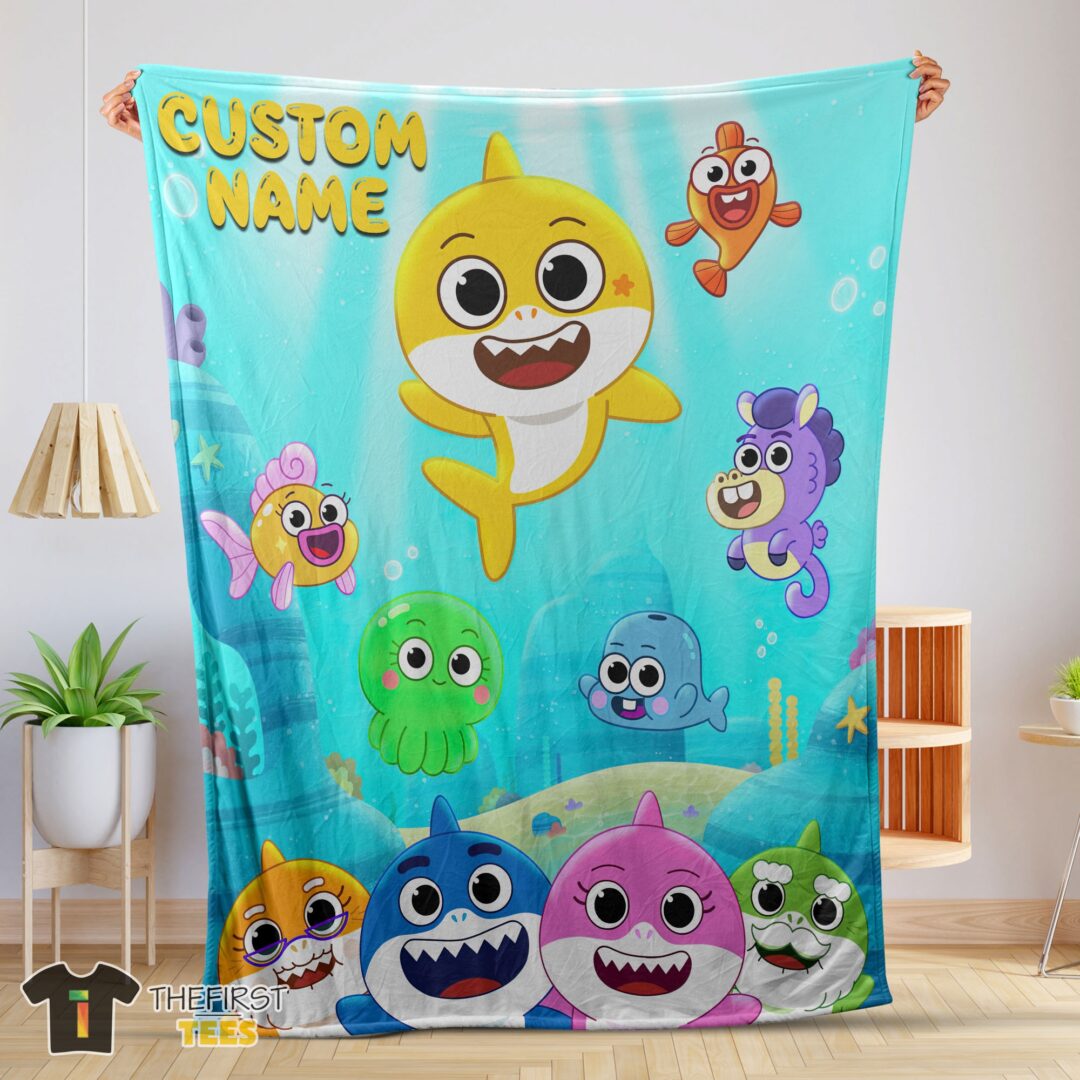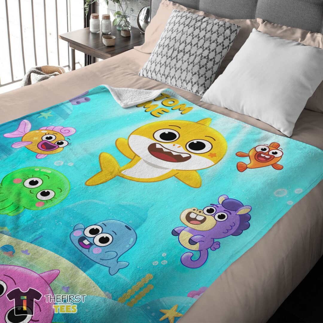 Cute Baby Shark & Friends Poster Yellow Text Blanket Fleece Customized Blanket