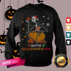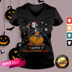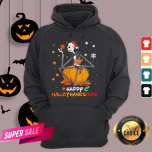 Funny Jack Skellington With Santa Hat Happy Hallothanksmas Shirt