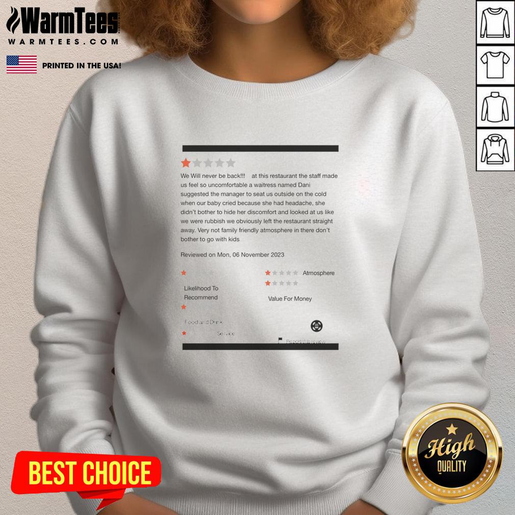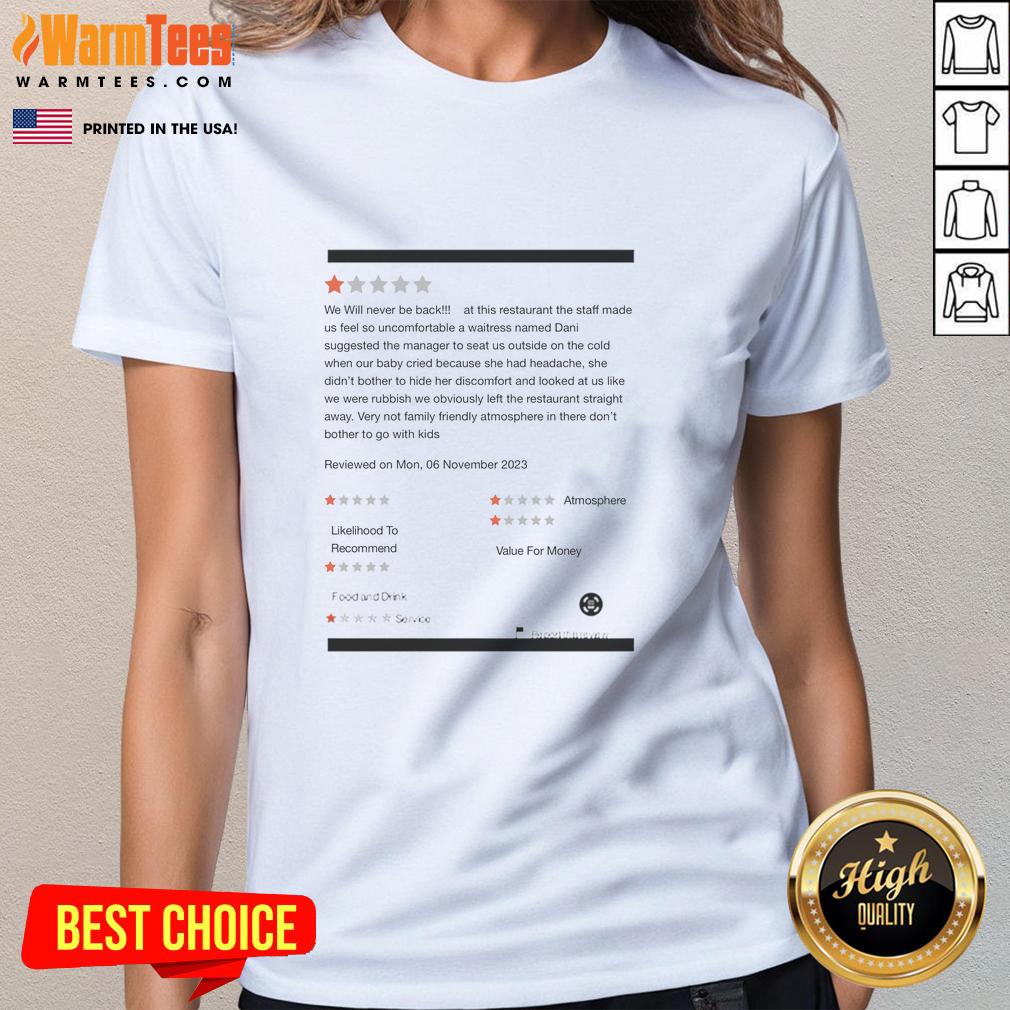 Funny We Will Never Be Back At This Restaurant The Staff Made T-Shirt