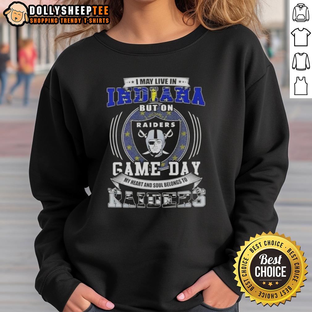 Good I May Live In Indiana But On Game Day My Heart And Soul Belongs To Las Vegas Raiders Football T-Shirt