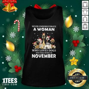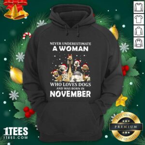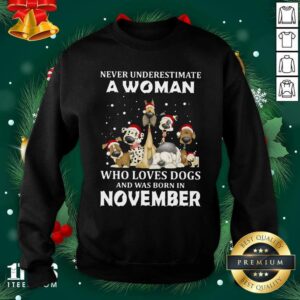 Good Never Underestimate A Woman Who Loves Dogs And Was Born In November Christmas Shirt