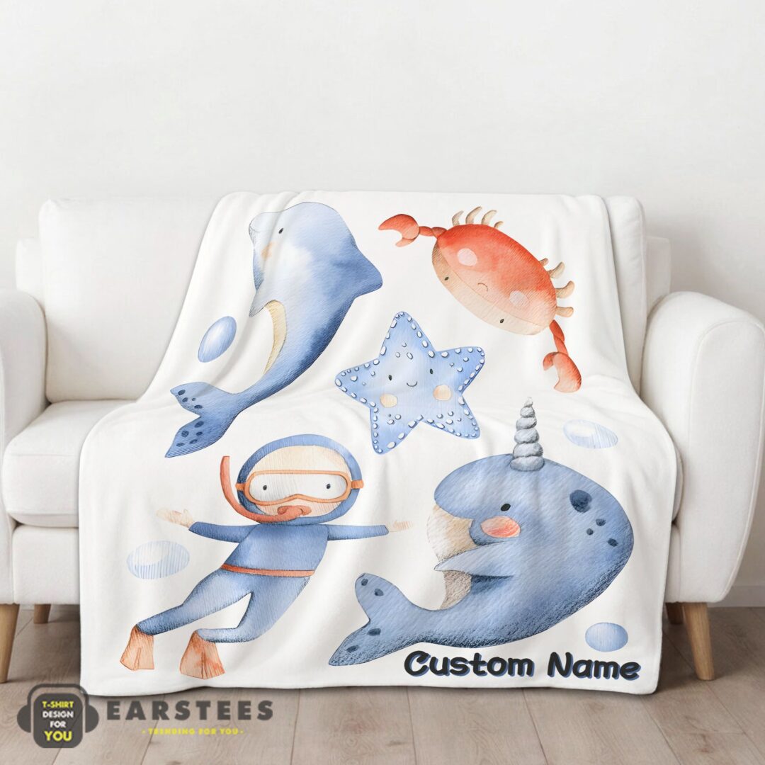 Good Sea’s Treasures Narwhal Dolphin Crab Starfish Scuba Divers Blanket Fleece Customized Blanket