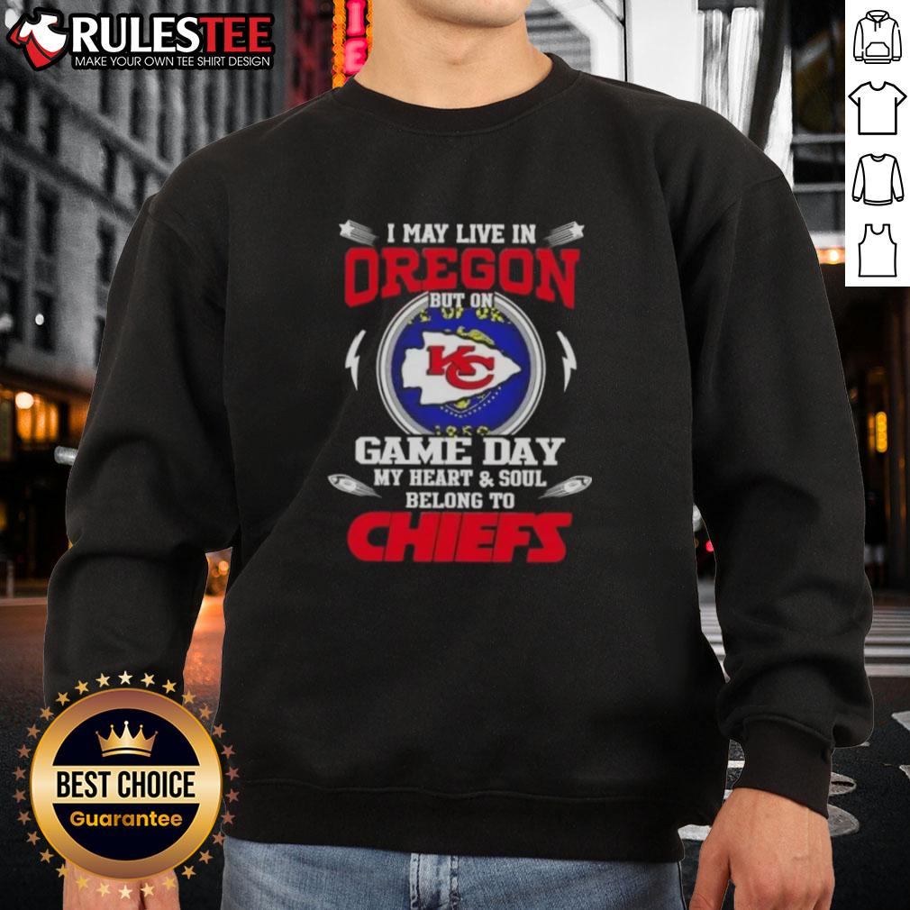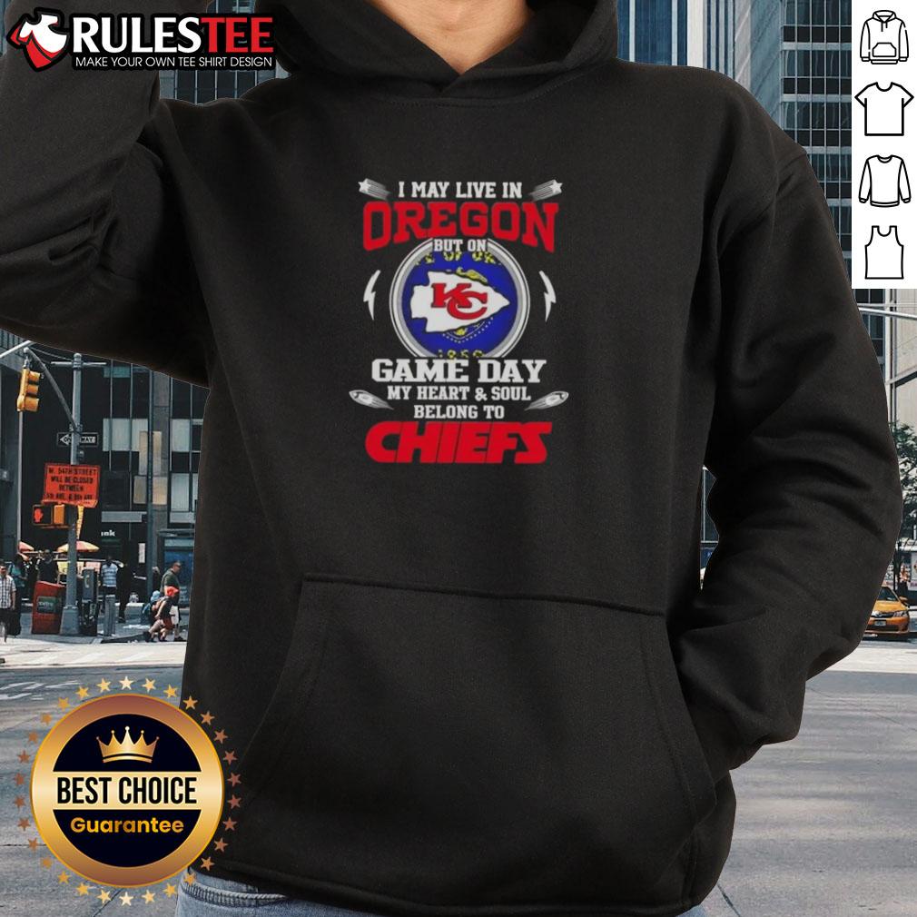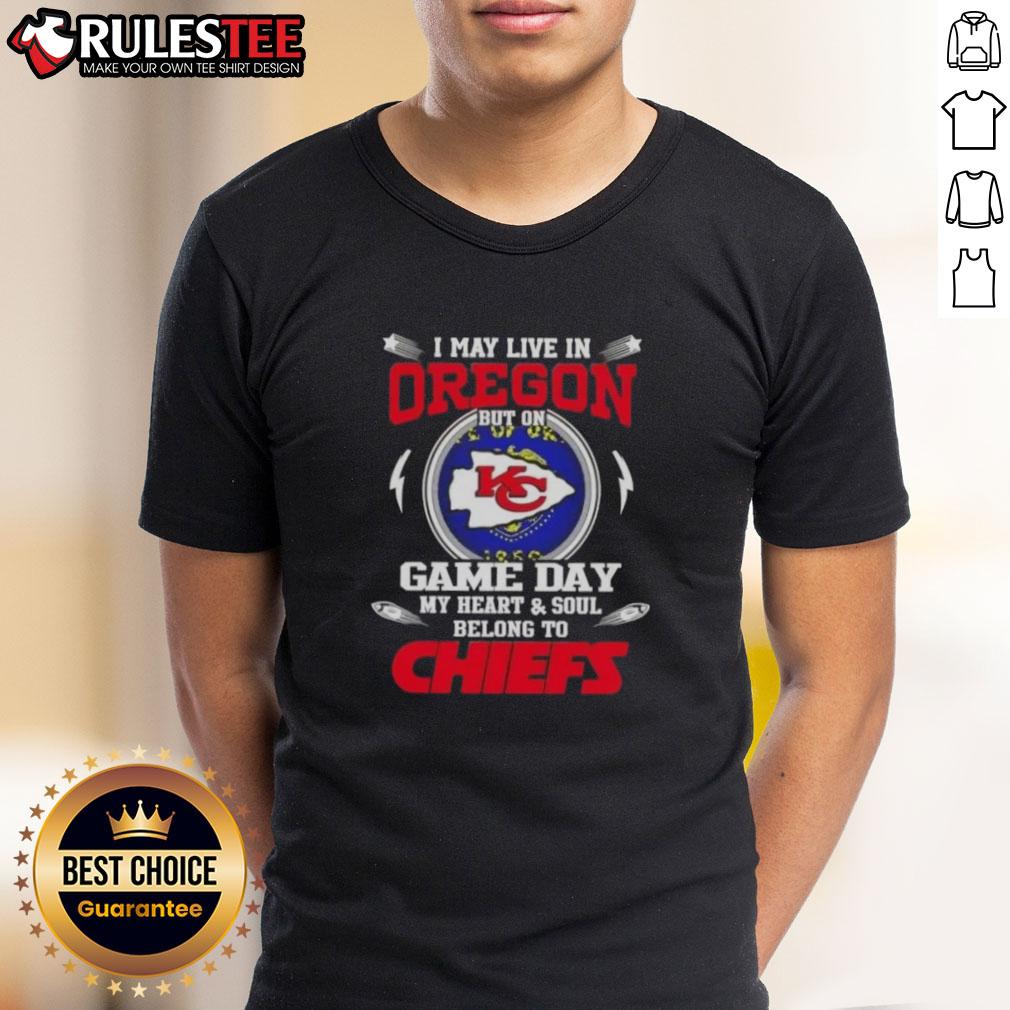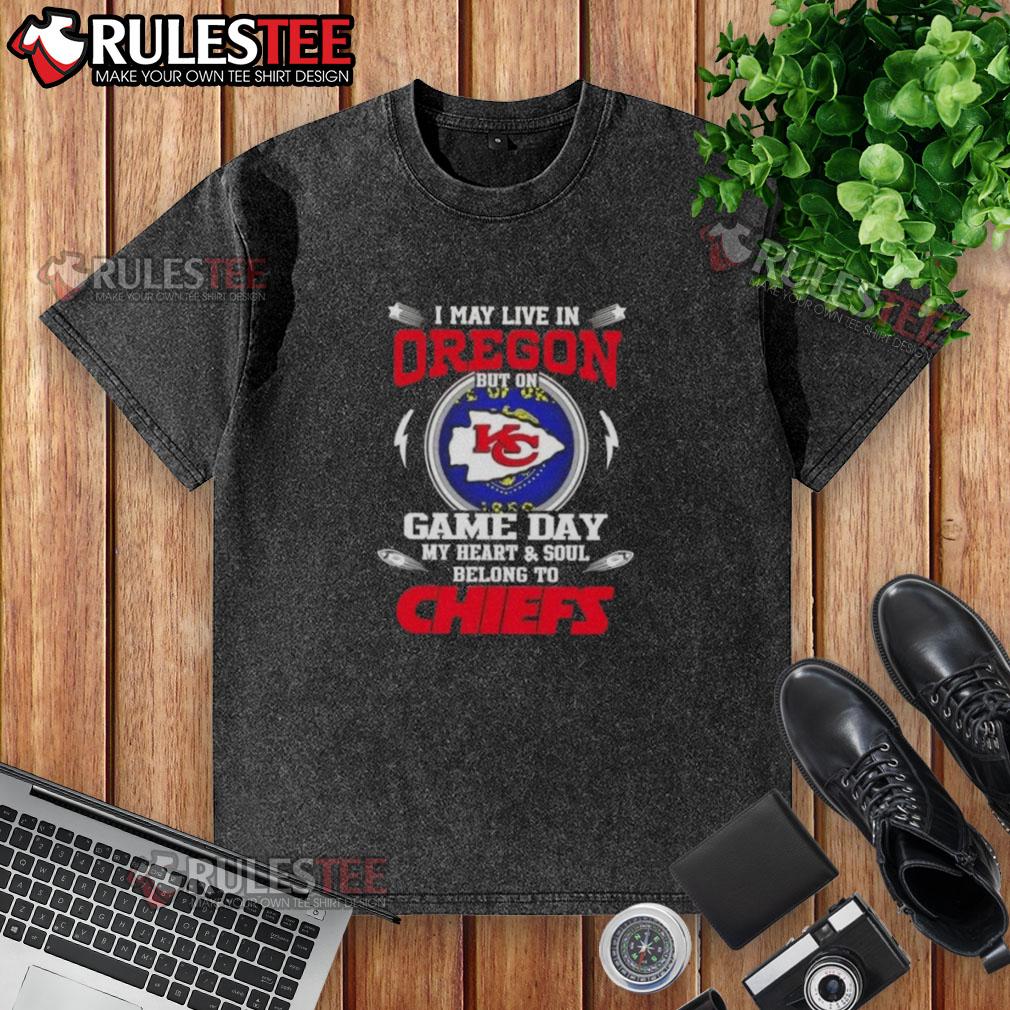 Happy I May Live In Oregon But On Game Day My Heart And Soul Belongs To Kansas City Chiefs T-Shirt