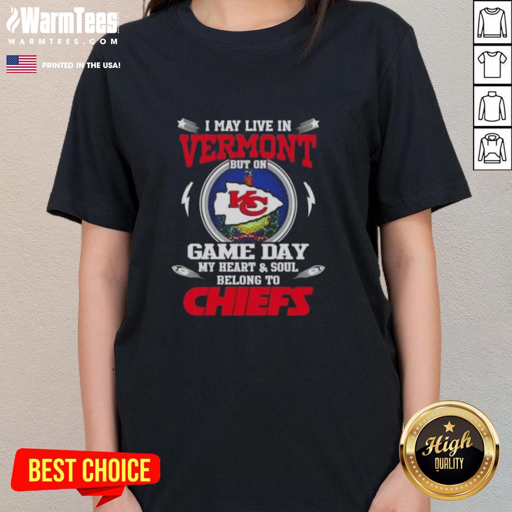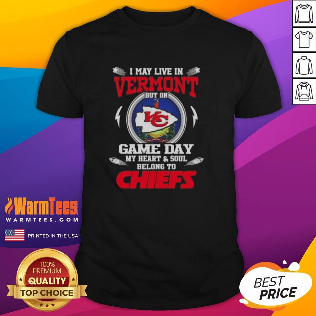 Happy I May Live In Vermont But On Game Day My Heart And Soul Belongs To Kansas City Chiefs T-Shirt