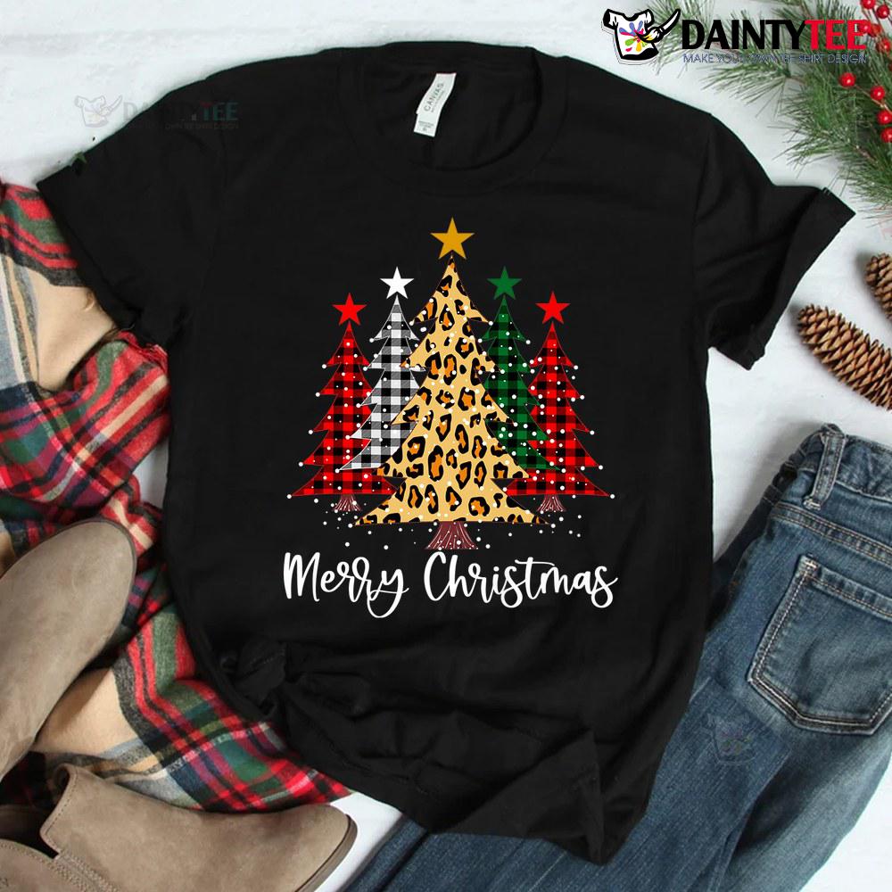Merry Christmas Trees With Buffalo Red Plaid Leopard Shirt