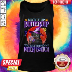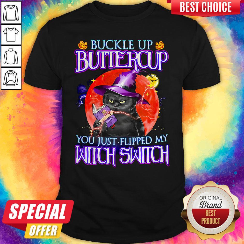 Official Black Cat Buckle Up Buttercup You Just Flipped My Witch Switch Sunset Halloween Shirt