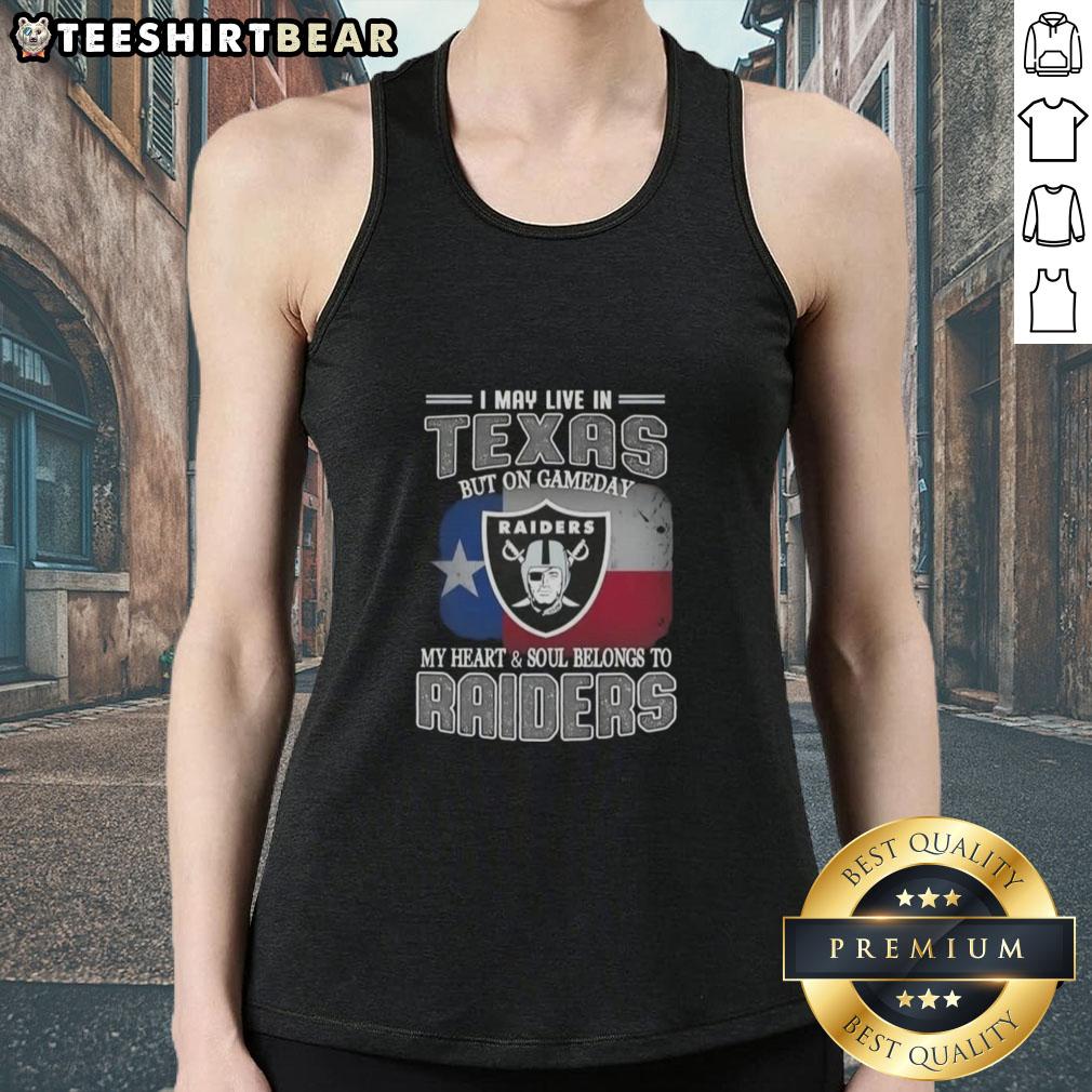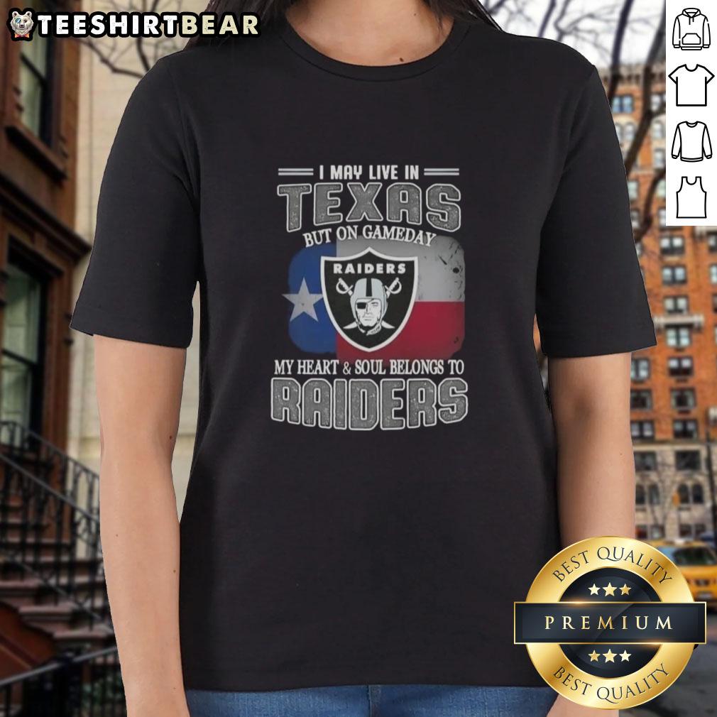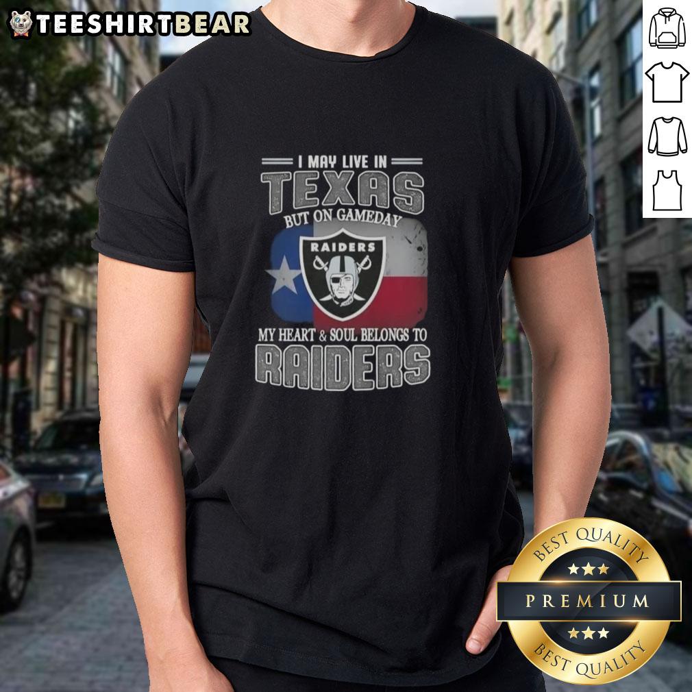 Official I May Live In Texas But On Gameday My Heart And Soul Belongs To Raiders T-Shirt
