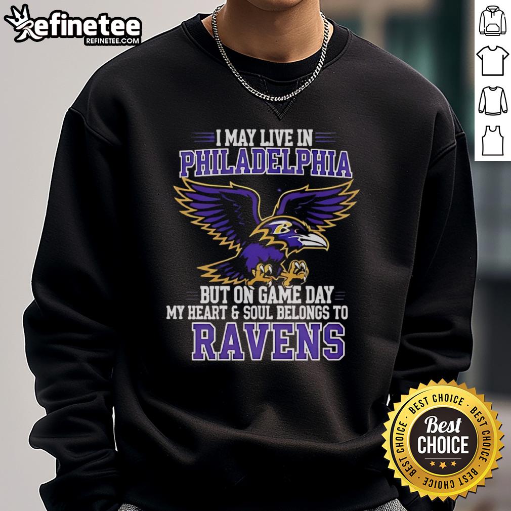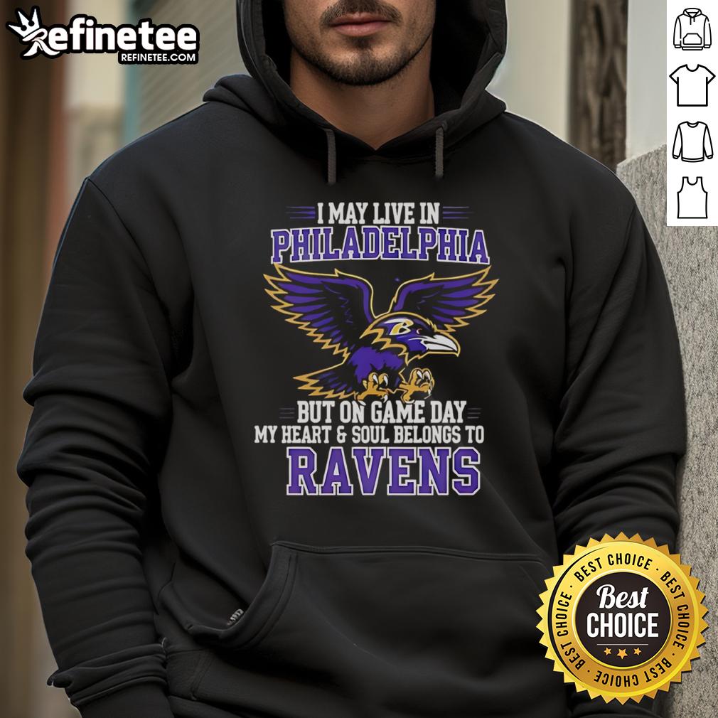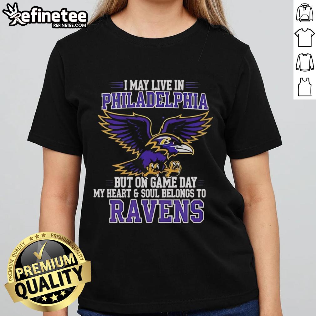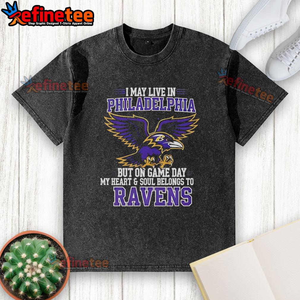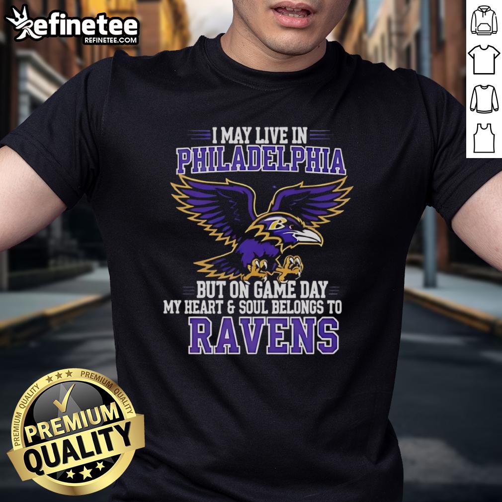 Original I May Live In Philadelphia But On Gameday My Heart And Soul Belong To Baltimore Ravens T-Shirt
