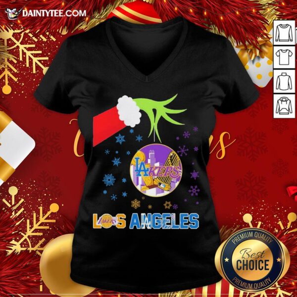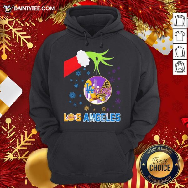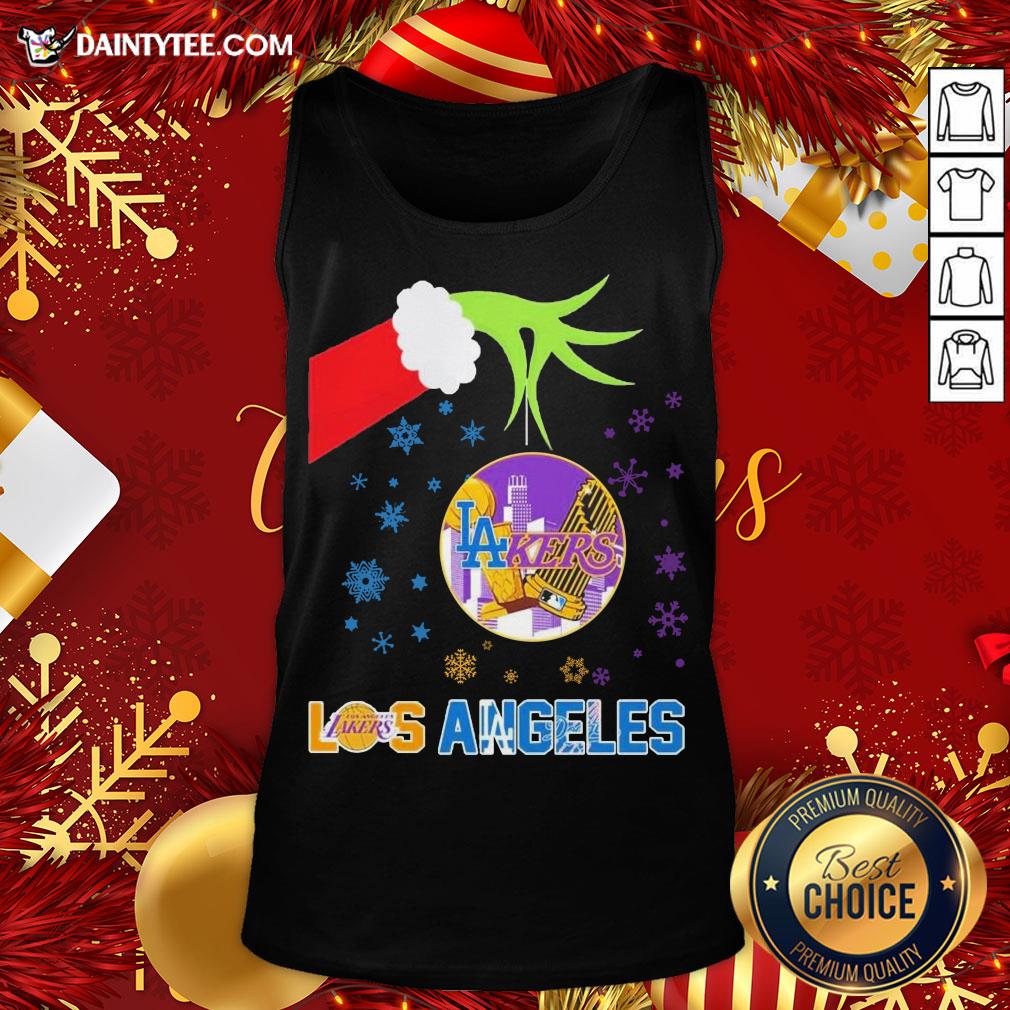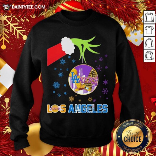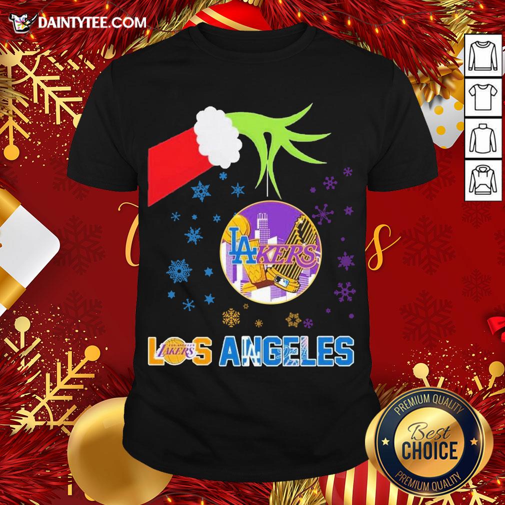Original The Grinch Hand Holding Ornament Los Angeles Lakers And Los Angeles Dodgers Christmas Shirt