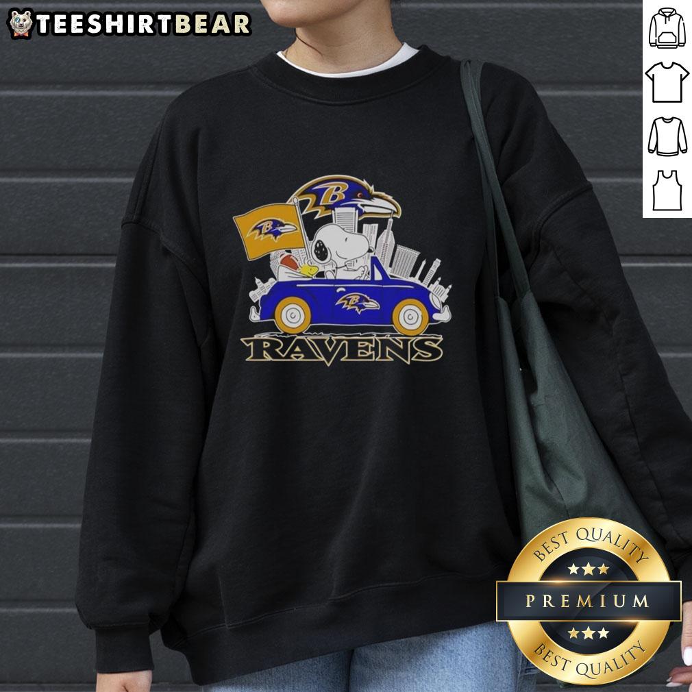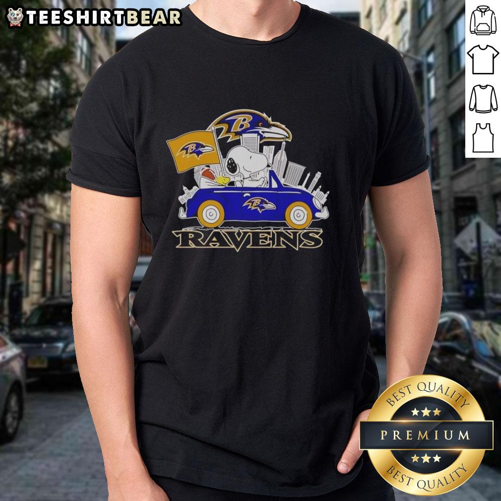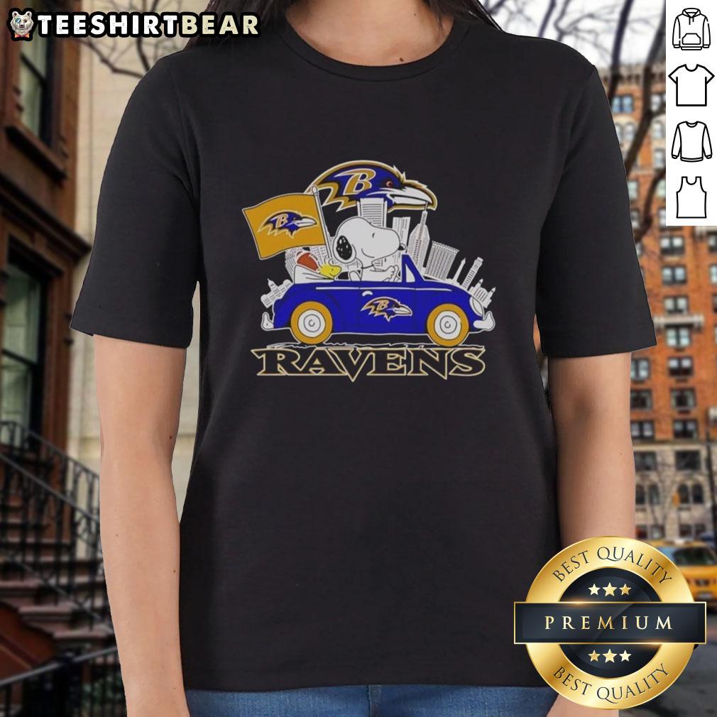 Top Snoopy And Woodstock Driving Car Baltimore Ravens City Skyline T-Shirt